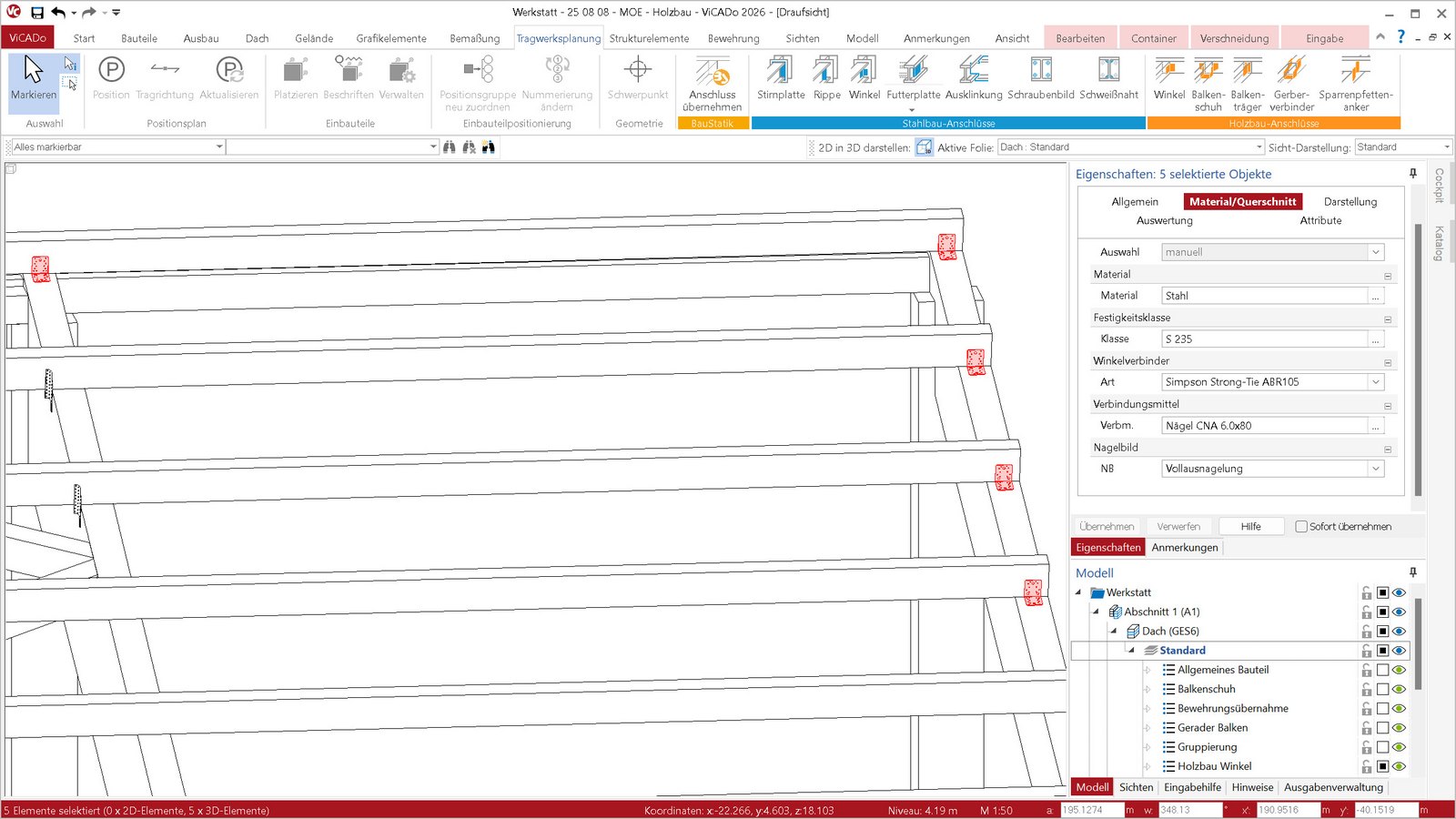 Anschlüsse im Holzbau: Vergleichbar zum Stahlbau spielen auch im Bereich des Holzbaus die Verbindungen zwischen Bauteilen eine wichtige Rolle. Diese Verbindungen werden im klassischen Holzbau als zimmermannsmäßige Verbindungen ausgeführt, wie z.B. ein Versatz oder ein Zapfen. Im Bereich des Ingenieurholzbaues werden in der Praxis häufig Stahlblech-Formteile wie Balkenschuhe oder Winkel eingesetzt. Diese Verbindungsmittel werden durch den Tragwerksplaner dimensioniert und sind in einer erforderlichen Stückzahl auszuführen. Bei einer konsequenten Durchbildung der Anschlüsse im virtuellen Gebäudemodell in ViCADo erfolgt eine Mengenermittlung ohne weiteren Aufwand.
