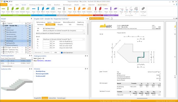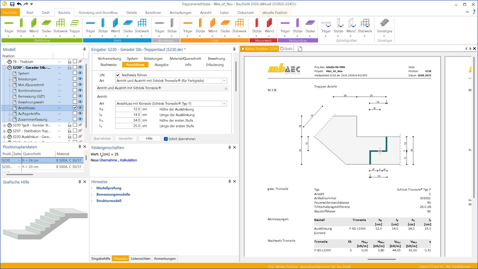 Treppen und Gründungen: Wichtige Erweiterungen in Detailpunkten! Bemessung von Treppenlagerungen mit Schöck-Tronsole® Mit der direkten Integration der Schöck Tronsole® in das Modul „S230.de StahlbetonTreppenlauf“ wird die mb WorkSuite 2026 um eine praxisgerechte Lösung für den Anschluss von Fertigteiltreppen mit erhöhten Schalschutzanforderungen erweitert. Die Tronsole® Typ F (Anschluss an Podest) und Tronsole® Typ B (Anschluss an Bodenplatte) vereinen Trittschalldämmung mit tragender Funktion und können im Kapitel „Anschlüsse“ für den Nachweis der Auflagerausklinkung gewählt werden.