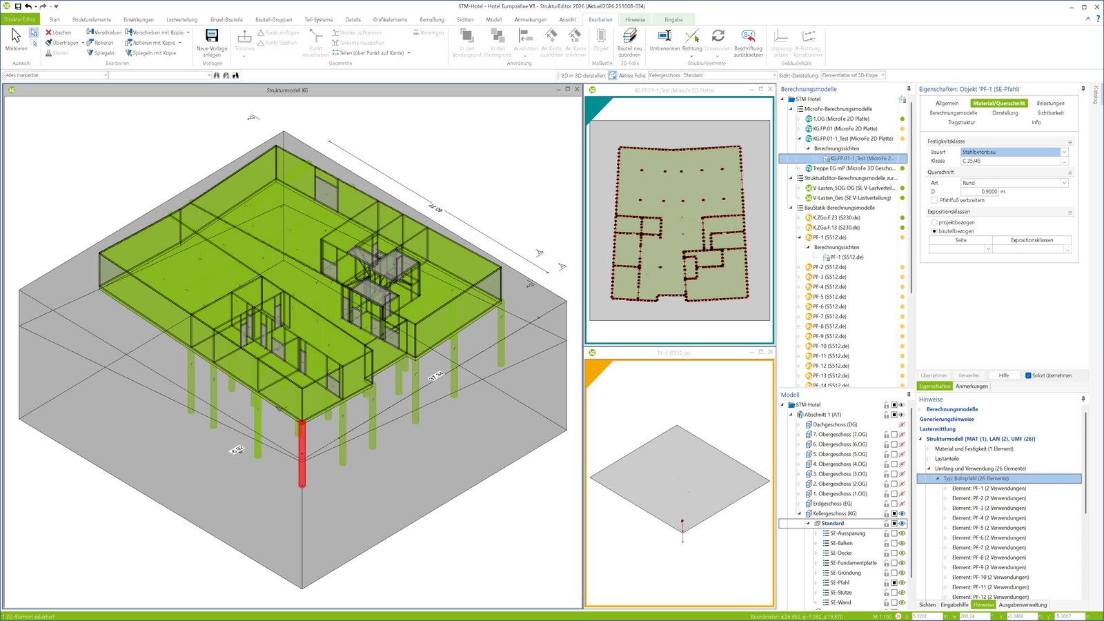 Der StrukturEditor ist das zentrale Werkzeug für die modellorientierte Tragwerksplanung. Als Systemlinienmodell bildet er die Grundlage für Nachweise, Lastermittlungen und Auswertungen. Spezielle Strukturelemente wie SE-Gründung und SE-Pfahl ermöglichen die präzise Modellierung von Bodenaufbau und Pfählen direkt im Strukturmodell. Die Daten werden konsistent an MicroFe und BauStatik übergeben – ohne doppelte Eingaben. So entsteht ein durchgängiger Workflow von der Modellierung bis zur geotechnischen Bemessung.