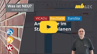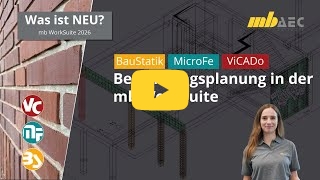 Im Bereich der Tragwerksplanung bietet die mb WorkSuite verschiedene Anwendungen wie BauStatik, MicroFe und ViCADo, die sowohl einzeln als auch kombiniert eingesetzt werden können. Im Rahmen der mbinar-Serie liegt der Fokus auf einem durchgängigen, modellorientierten Einsatz der mb WorkSuite. Die Vorträge zeigen, wie effizient der Datenaustausch zwischen den Anwendungen funktioniert. Viele der gezeigten Arbeitsschritte und Tipps lassen sich auch auf die Einzelanwendung übertragen. Seien Sie live mit dabei und erleben Sie die Leistungsfähigkeit der mb WorkSuite 2026 in Aktion! Wir freuen uns auf Ihre Teilnahme.